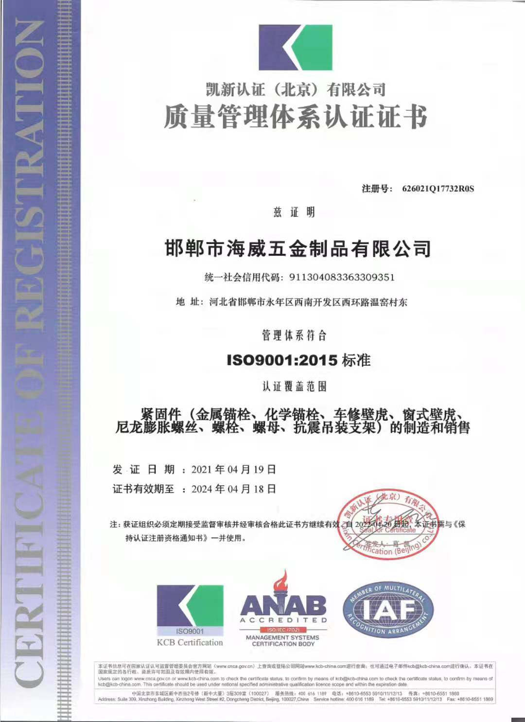首頁>>關(guān)于我們邯鄲市海威五金制品有限公司是一家專業(yè)從事于工業(yè)、汽車緊固件及建筑錨固件研發(fā)和制造企業(yè),并通過了ISO9001質(zhì)量管理體系認(rèn)證,公司產(chǎn)品涵蓋: DIN931、DIN933、DIN6921、DIN975、DIN934、DIN315、DIN912、DIN985、DIN6923,化學(xué)錨栓,熱鍍鋅化學(xué)錨栓,后擴(kuò)底機械錨栓,車修壁虎,特殊倒錐型錨栓、窗式壁虎、倒錐形錨栓、各種金屬錨栓,尼龍、塑料膨脹鉆尾螺絲以及其他領(lǐng)域?qū)I(yè)錨栓、建筑五金配件、抗震支架、哈芬槽系列及注射式植筋膠。產(chǎn)品已出口到歐洲,非洲,北美,東南亞等國家和地區(qū)。且與眾多的國際大型經(jīng)銷商建立了良好的合作關(guān)系。
