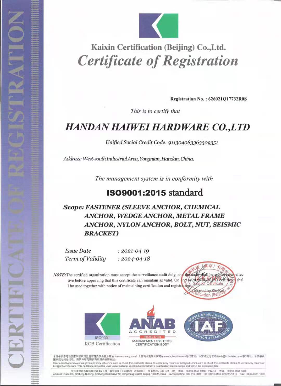 HANDAN HAIWEI HARDWARE Co.,LTD. is a company specializing in the research and development and manufacturing of Industrial、automotive fasteners and building anchors. It has passed the ISO9001 quality management system certification. The company's products cover: DIN931, DIN933, DIN6921, DIN975, DIN934, DIN315, DIN912, DIN985, DIN6923, chemical anchors, hot-dip galvanized chemical anchors, rear-expanded bottom mechanical anchors, car repair wall anchors, special inverted cone anchors, window wall anchors, inverted cone anchors, various metal anchors, nylon, plastic expansion and other professional anchors in other fields, building hardware accessories, seismic brackets, Hafen slot series and injection-type anchor glue. Products have been exported to Europe, Africa, North America, Southeast Asia and other countries and regions. And we have established good cooperative relations with many large international distributors.